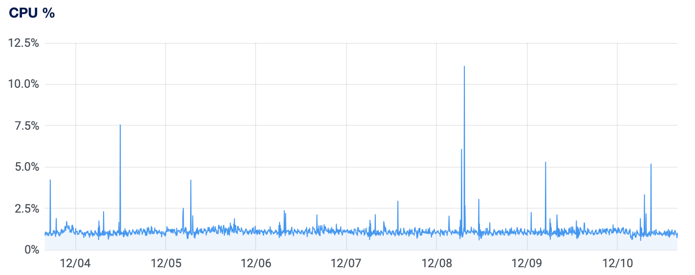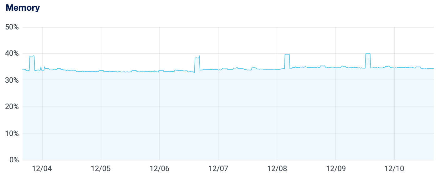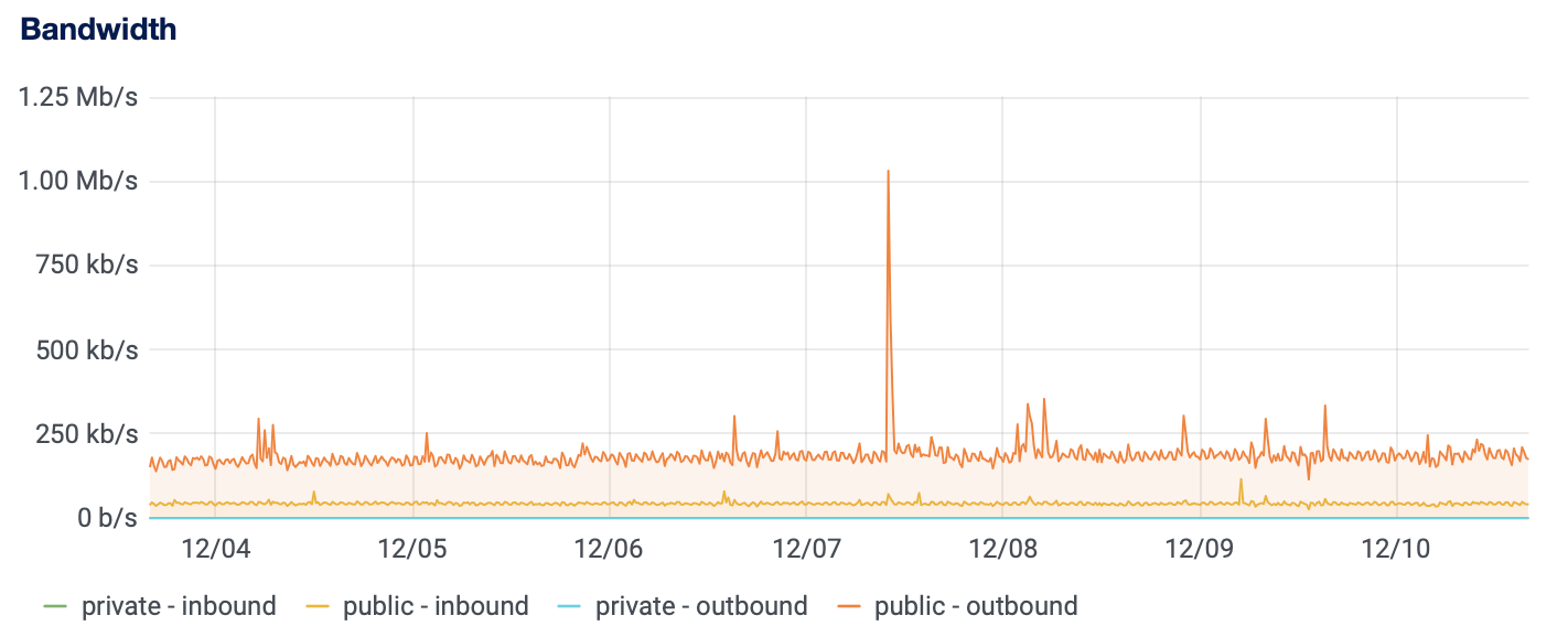As far as normal traffic and load goes for an RPKI repository of our size, we can see that running these components together can easily be done on a single small virtual machine (1 vCPU, 1GB of memory), as can be seen by the server load, memory usage and bandwidth in the graphs below:
