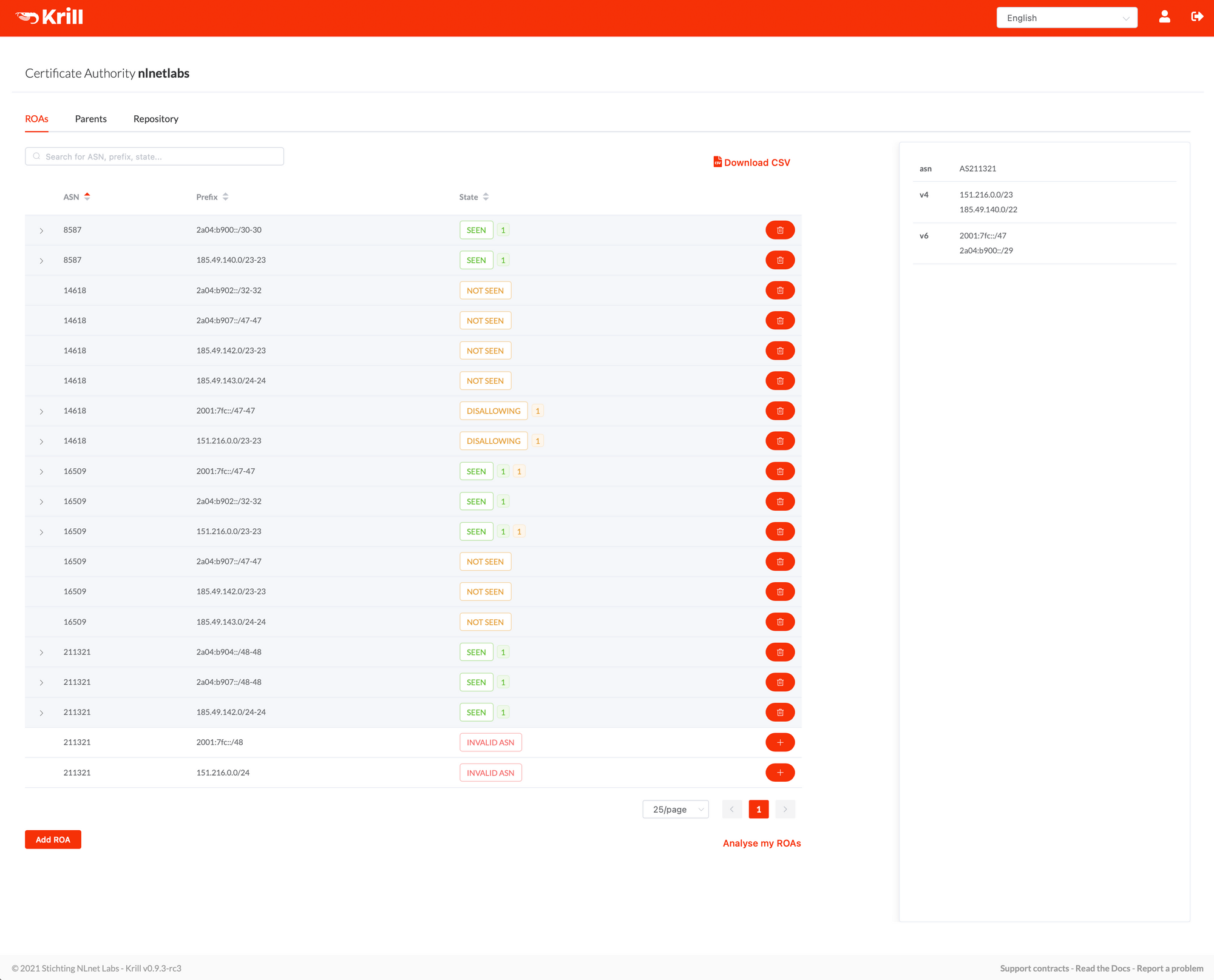krillc pubserver publishers add --request ./pub-req.xmlThen we copied the 'Repository Response' XML shown on the command line and uploaded it in our CA UI. Now that our CA knew where it could publish it automatically requested a certificate from its parent (RIPE NCC) - which was received a couple of seconds later. All that remained was to set up our ROAs – including some ROAs for RPKI invalid beacons for research - and called it a day...