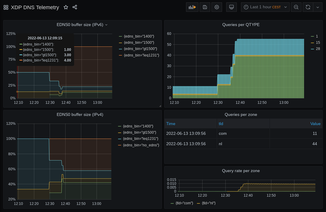 The XDP programs we’ve so far described in this series have been actively modifying DNS packets to perform functions such as response rate limiting (RRL), cookies and padding. This time, we’ll look into a passive BPF-program which enables us to plot graphs of DNS metrics without altering the DNS packets or touching the DNS software itself.