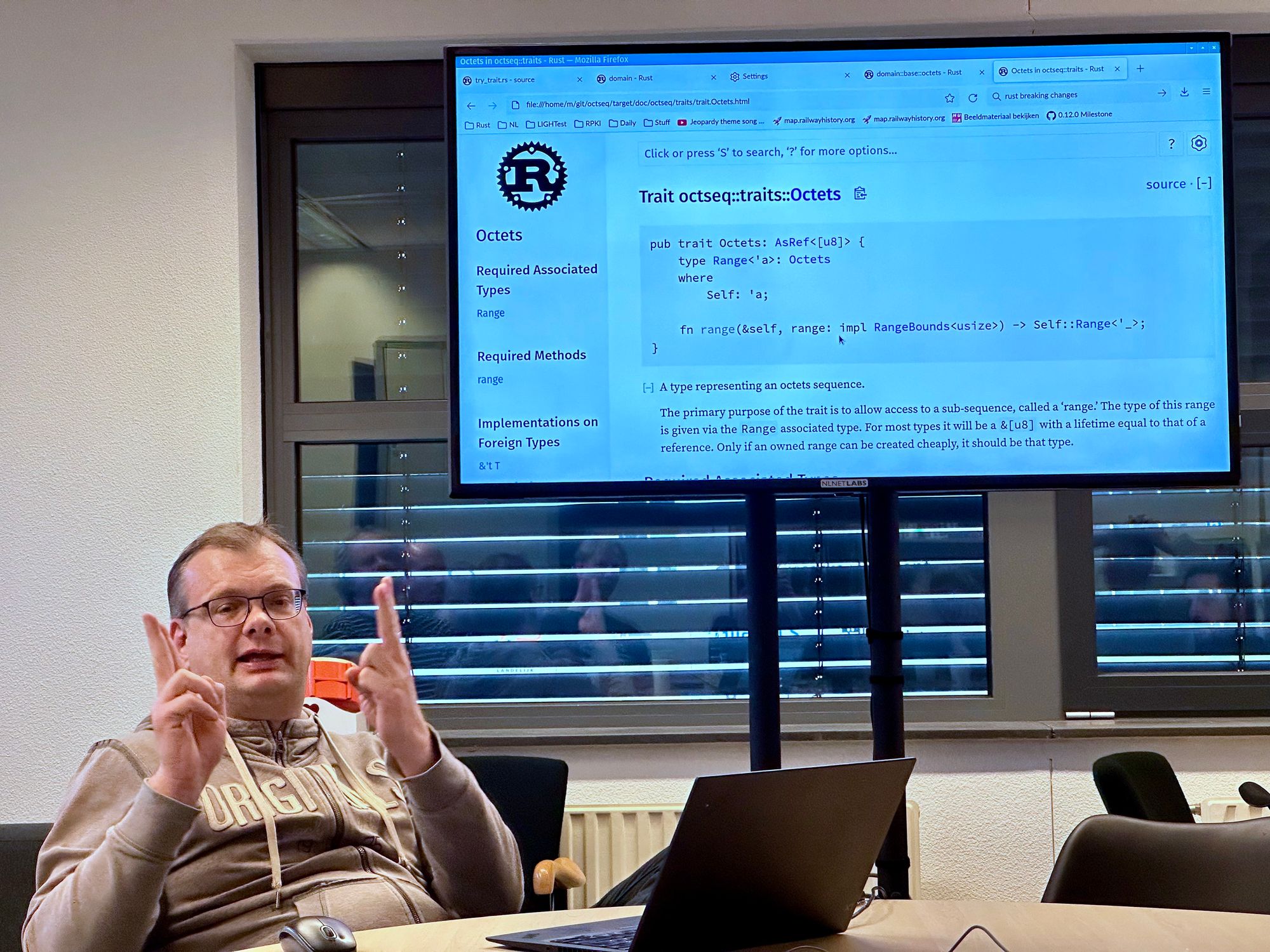 Martin gave the entire DNS development team a rundown of the domain crate and associated libraries, such as octseq. This kicks off our five-year mission* to take all of the lessons learned from our major DNS projects such as NSD and Unbound—but also our experimental projects like getdns and connectbyname—to build easy-to-use, memory-safe DNS solutions in Rust that guarantee performance, privacy, security, and make use of the latest standards.