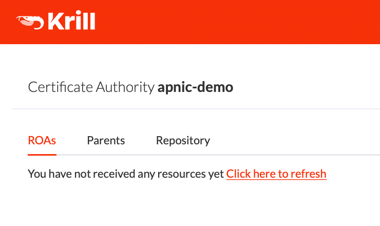 After uploading this response, Krill will notice that both a parent and a repository have been configured and it will show the ROA page. But usually you will be taken here just before Krill finishes successfully requesting its certificate from the APNIC parent: