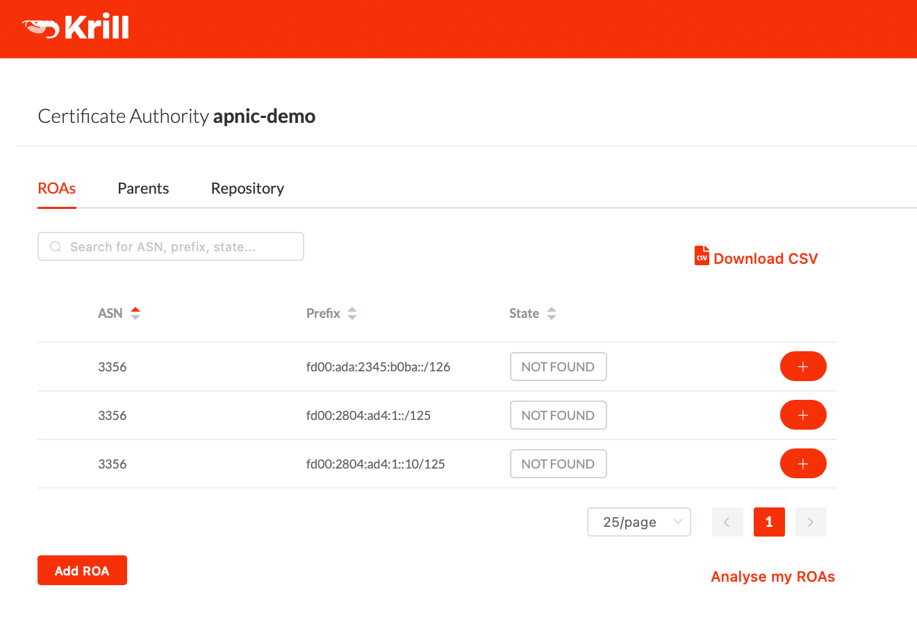 After installing and configuring the Krill server it's time to create your own new CA instance. In this post we will use a CA called "apnic-demo". It will receive private use IP addresses and AS numbers - since we (NLNet Labs) are not actually a member of APNIC.