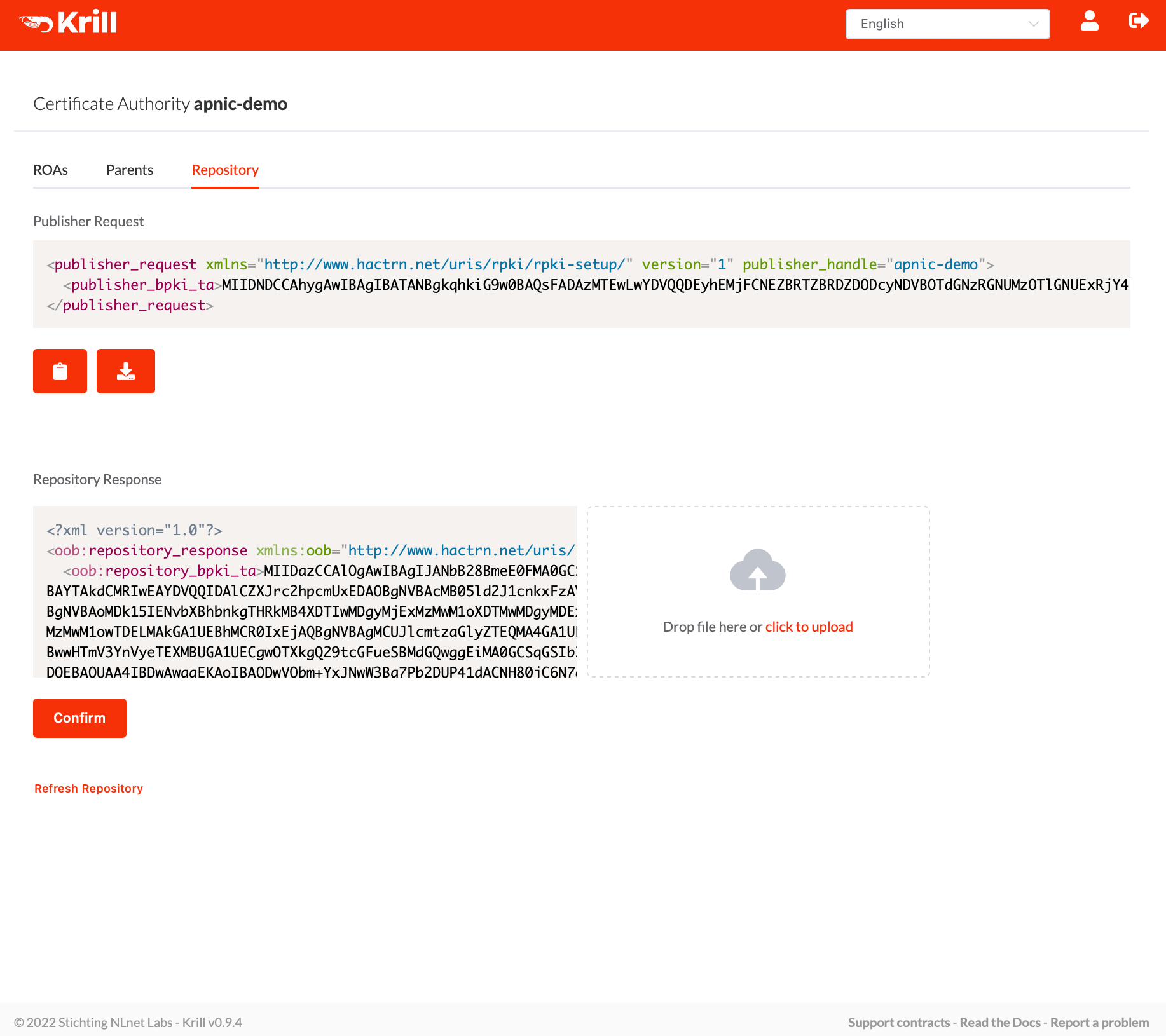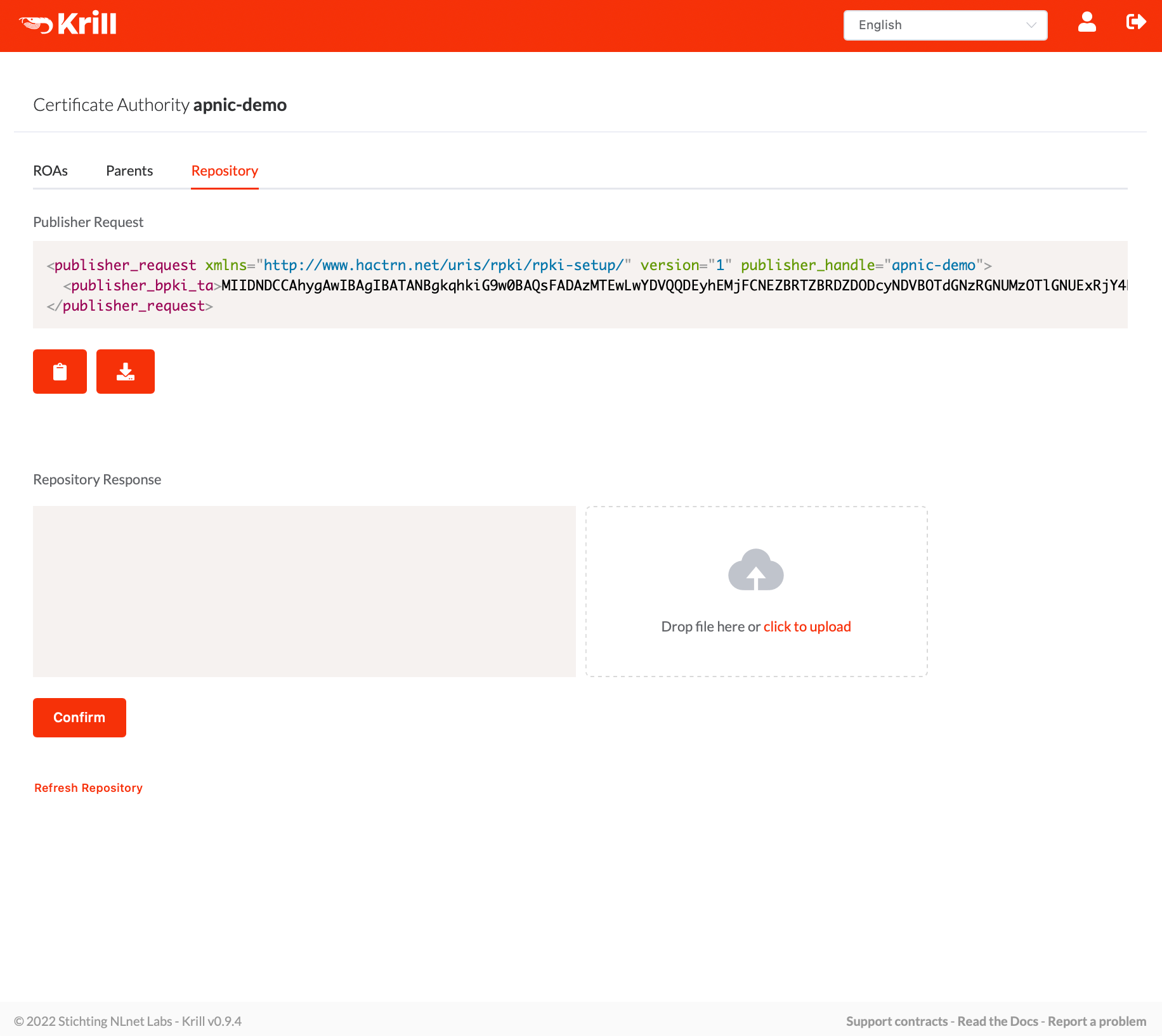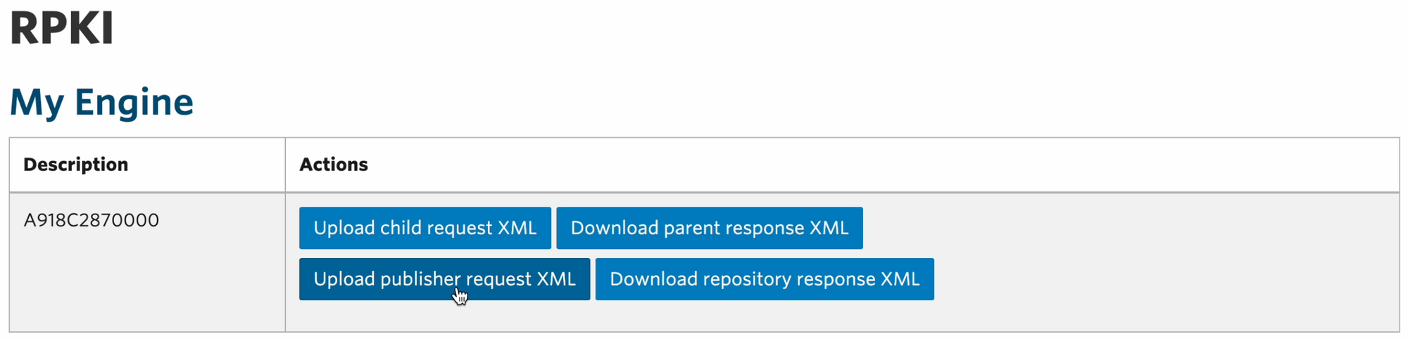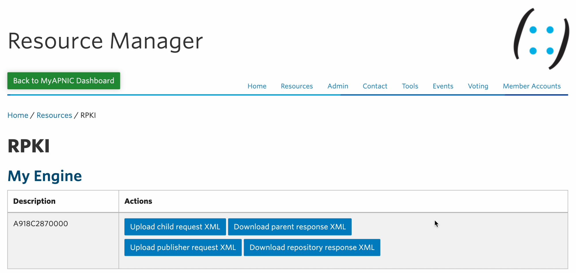 Then upload this "publisher request" XML file in the MyAPNIC portal. You can only do this after successfully submitting the "child request", because the APNIC system insists that the "handle" used in both requests match. As a user you won't need to worry about this in practice, but in case it would be relevant for communications with APNIC support it may help you to know that Krill will simply use your locally chosen CA name for this purpose.