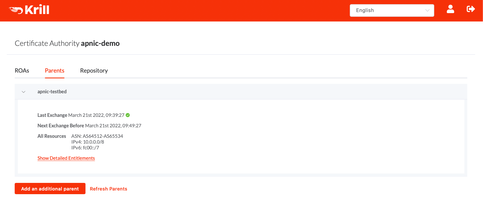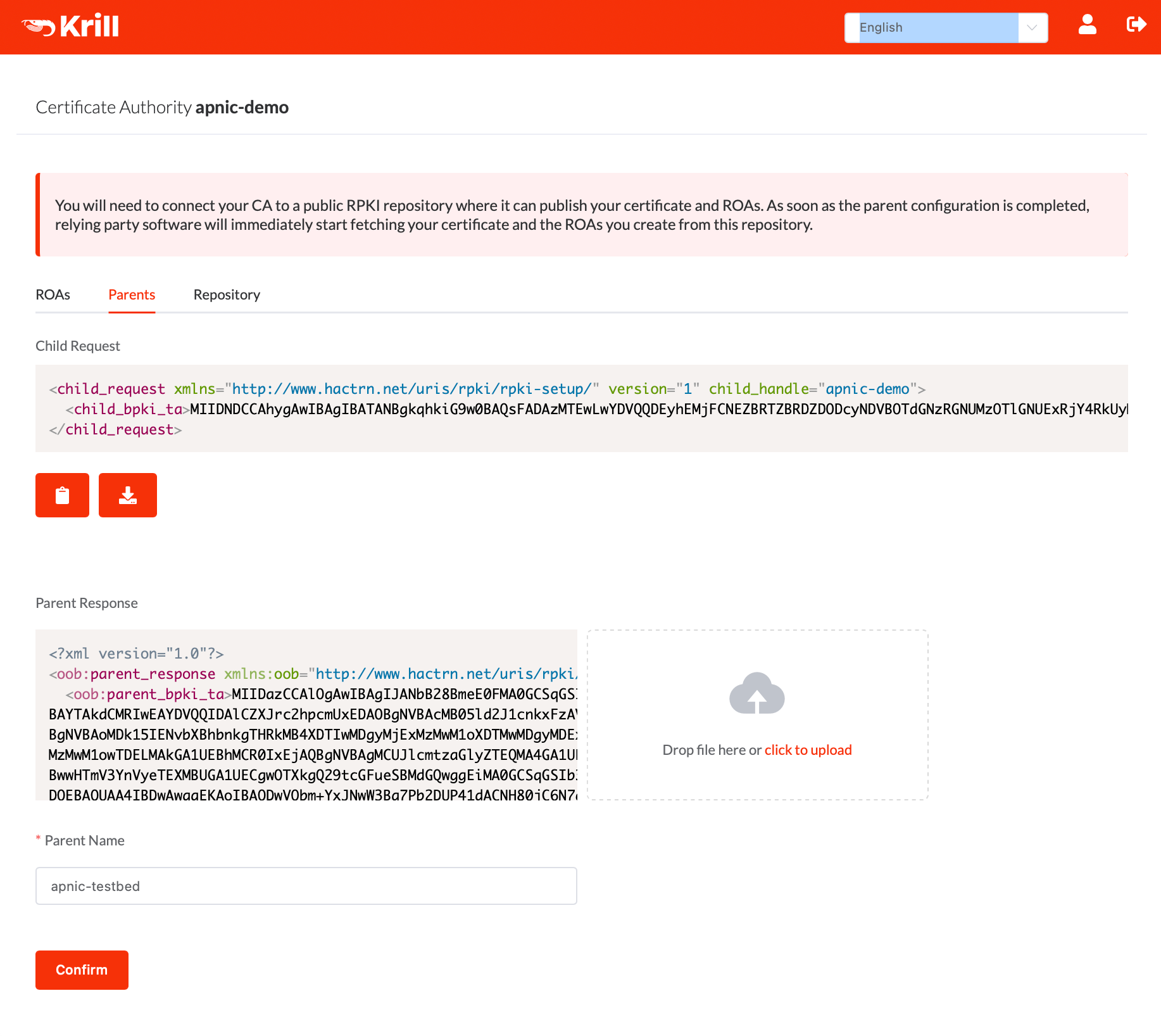 For the parent name you can choose anything you like. Here we use 'apnic-testbed'. This name will be used to name this parent to users of krill, but it is not used in the actual communication with the parent system: