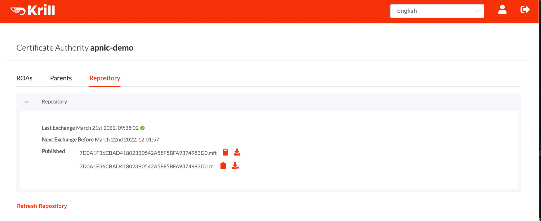 On the "Repository" tab you can then see that Krill had publishes a manifest and CRL for the received certificate. No ROAs of course, because you did not configure any just yet: