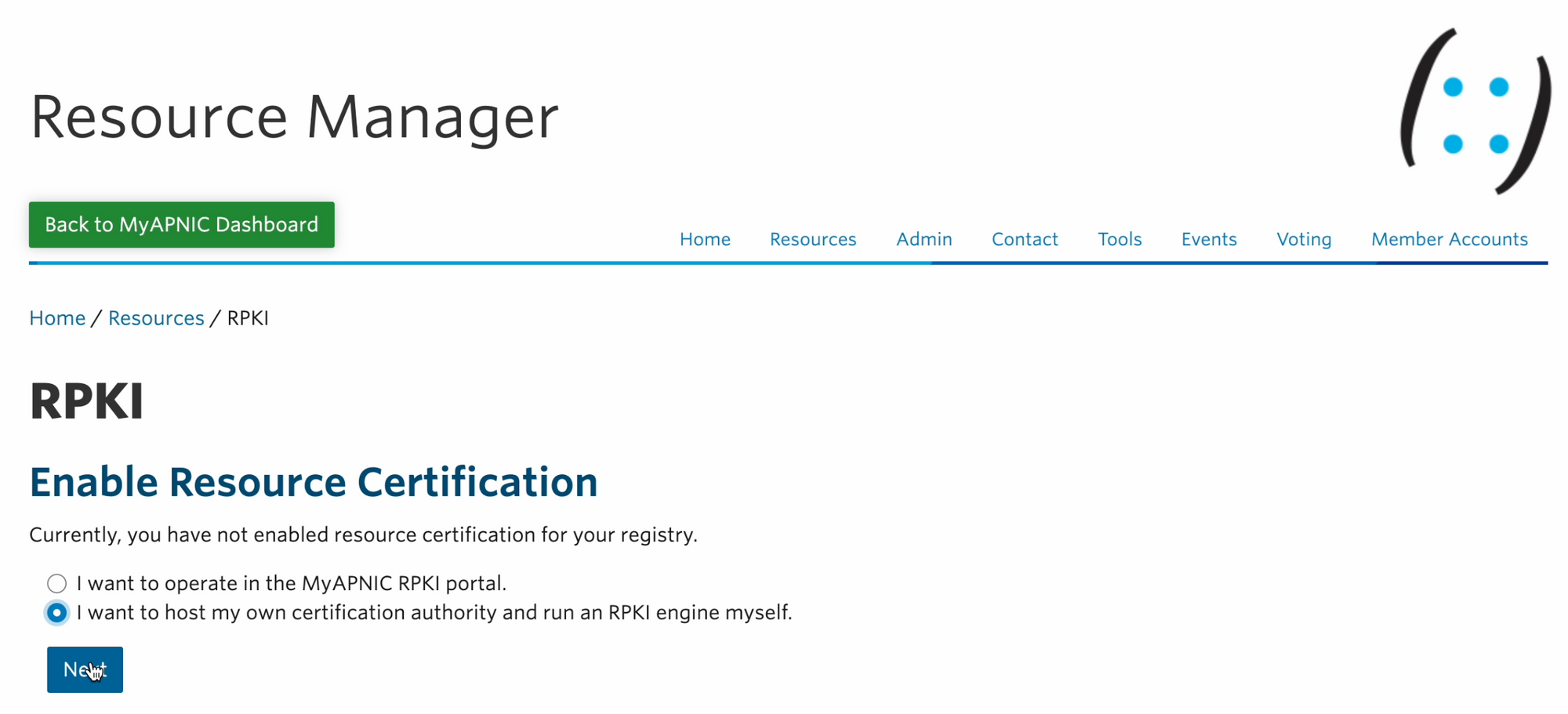 A todo item to "Set up RPKI" is also shown under the Resource Manager and again under the "Resource certification" section in its "Resources" tab. After clicking the link we enter a set up dialogue, where we choose the option to "host my own certification authority":