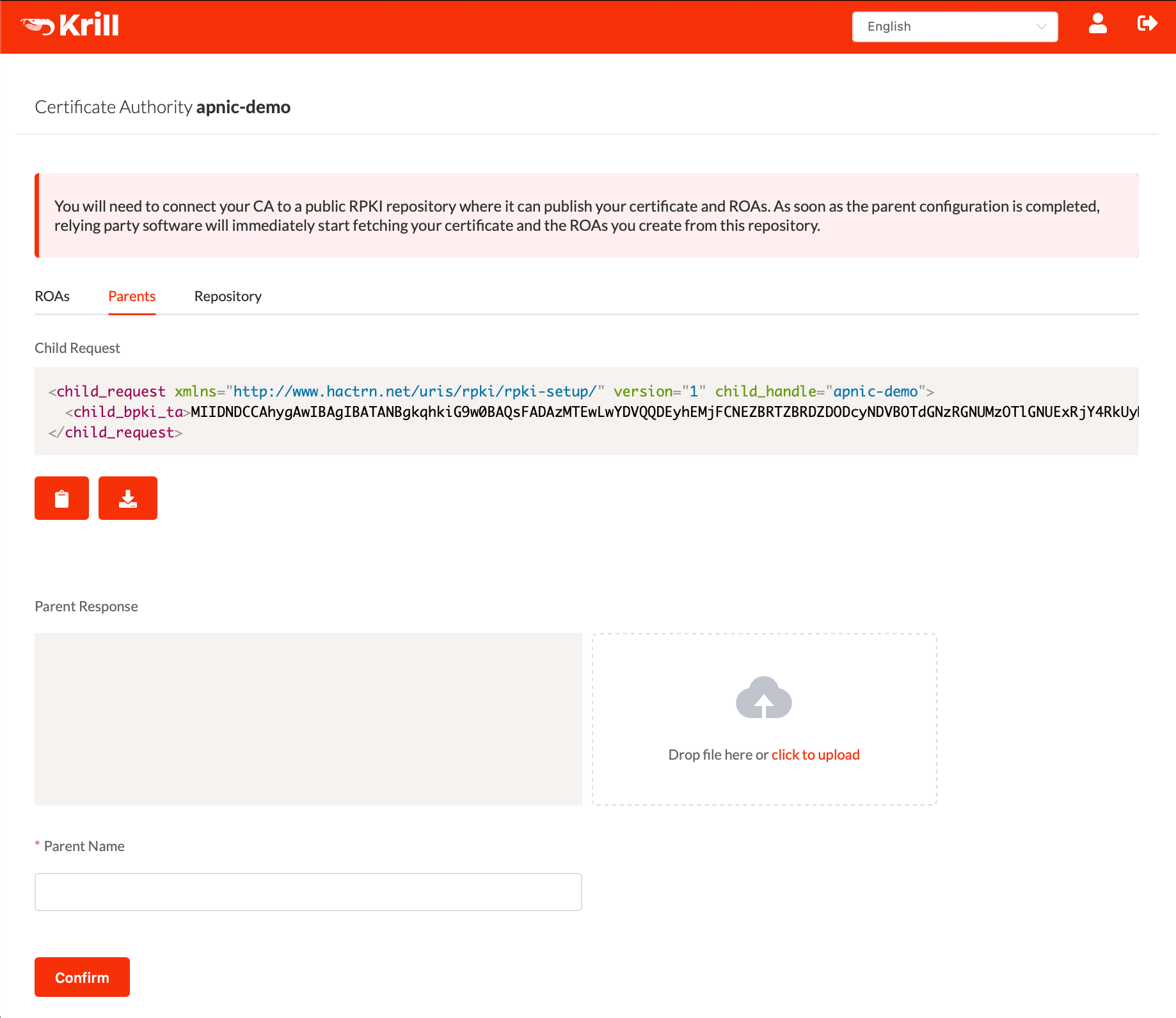 The Identity XML file mentioned above is our Krill CA's RFC 8183 Child Request XML file which can be copied or downloaded under the "Parents" tab:
