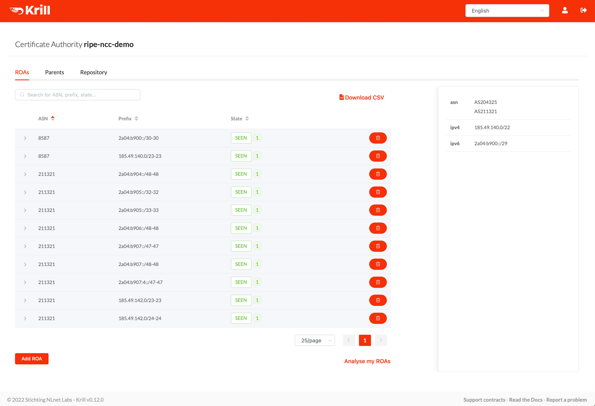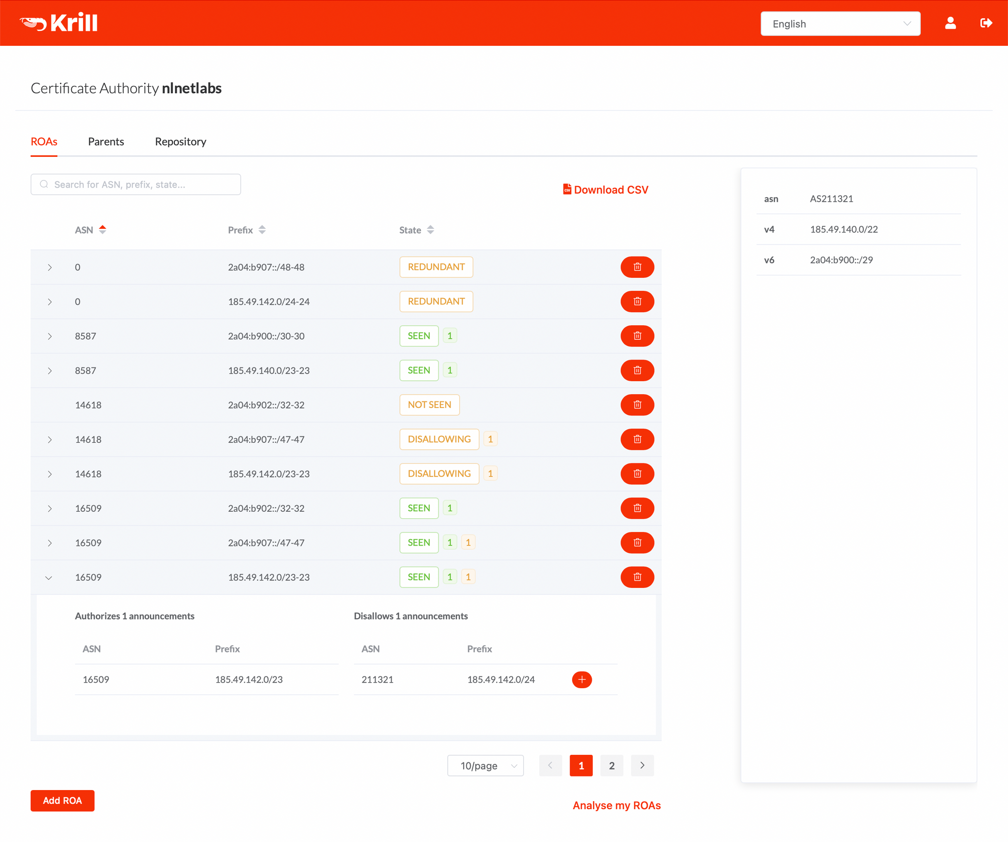 After authorising a route origin, you'll see a green SEEN label appearing that indicates that the route is announced and authorised by a ROA. As your BGP annoucements or ROAs change over time, you can see several other statuses as well, which you can read about in the Krill documentation: