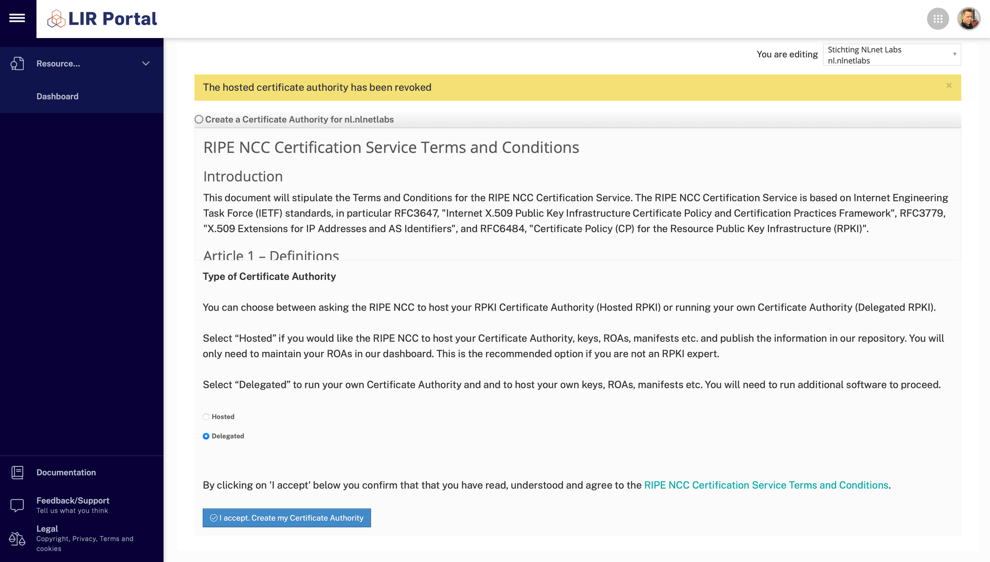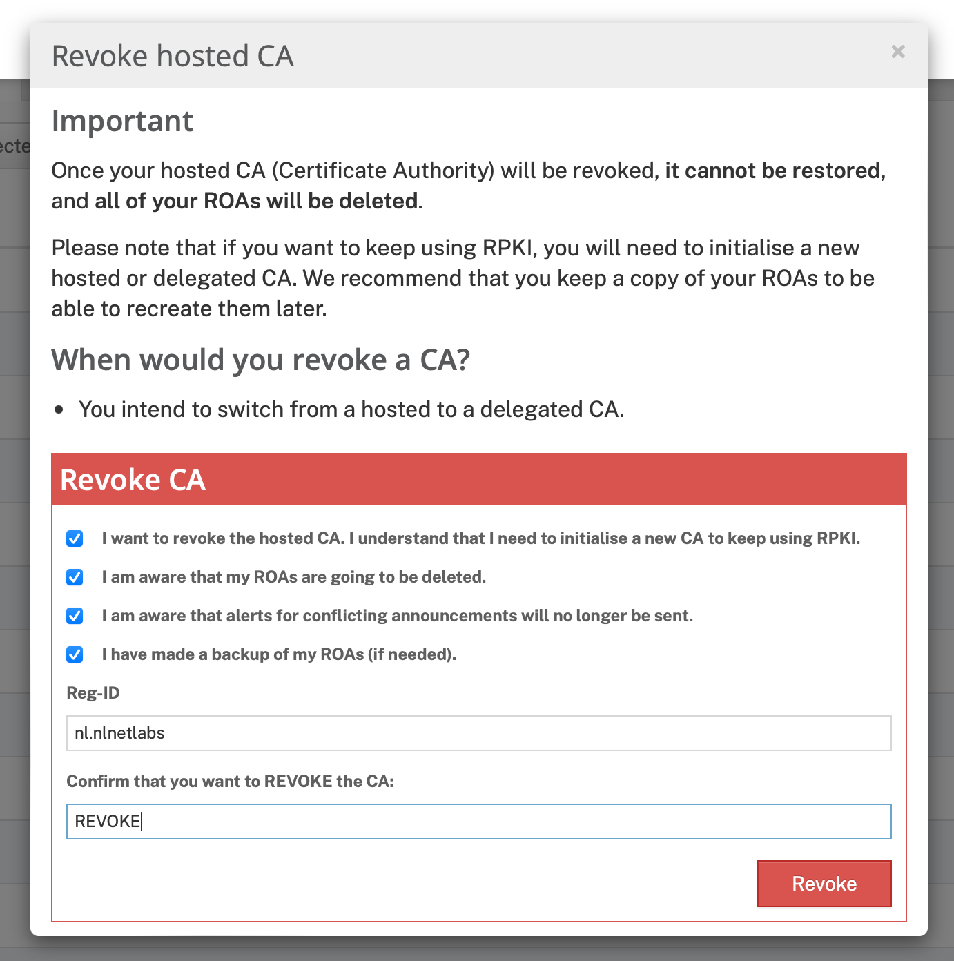 As said, if you're currently using Hosted RPKI you'll need to delete your existing configuration. In the bottom right corner of the RPKI dashboard in the LIR Portal you'll find a red link saying "Revoke hosted CA". Click it, check all the checkmarks and fill in the required fields: