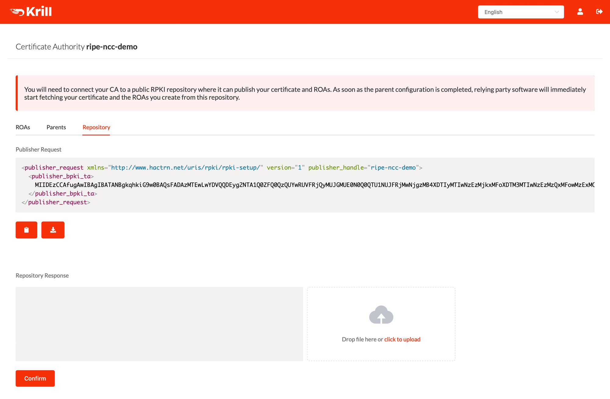 Upload the Repository Response XML file into the corresponding field in the Krill user interface and click Confirm. Alternatively, you can do this on the command line using krillc repo configure: