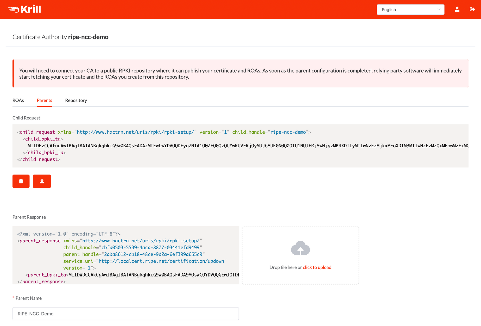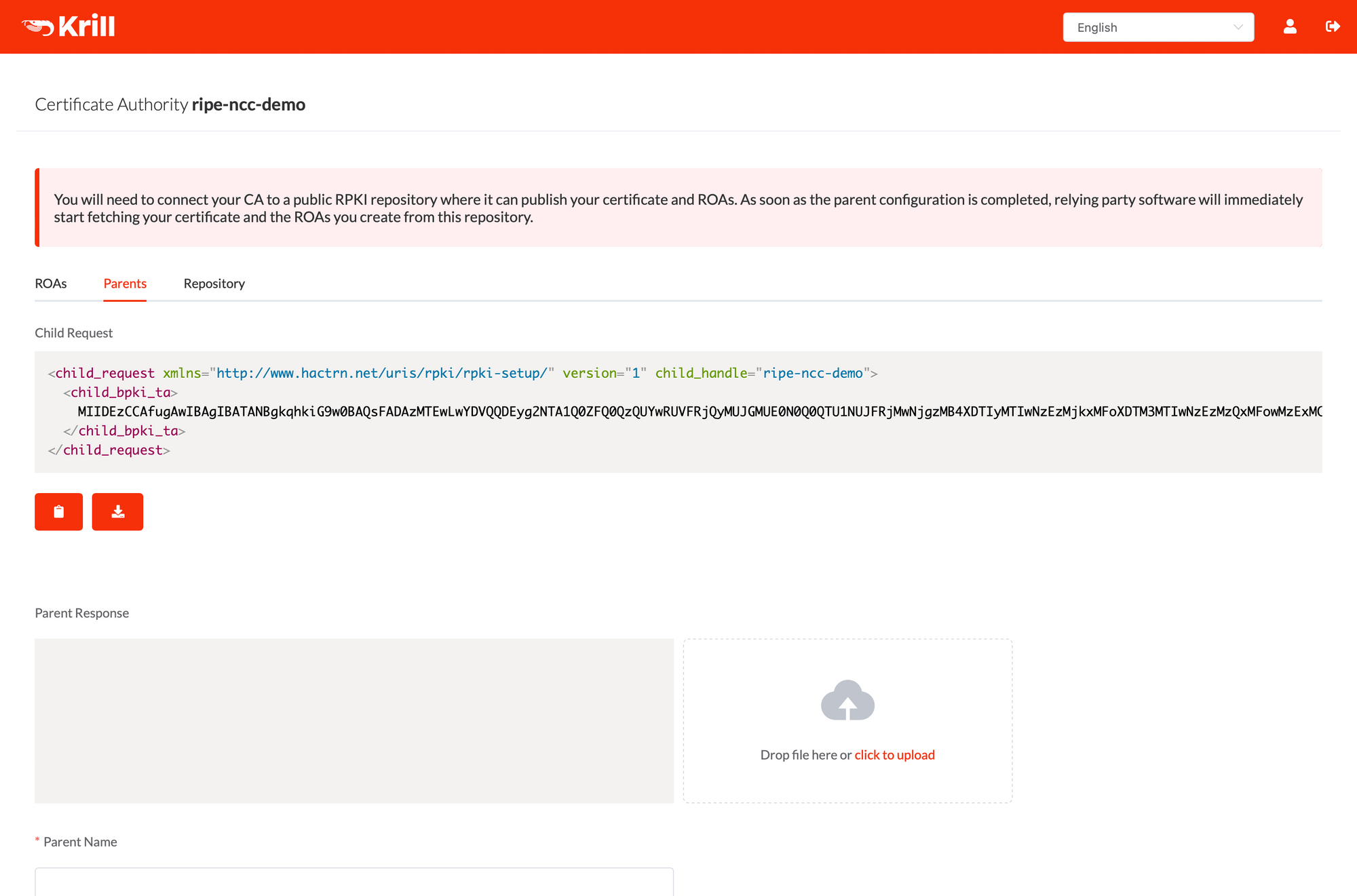 The first step is to provide your RFC8183 Child Request XML file to the RIPE NCC. Do do this, go to the Parents tab in Krill and download the request file: