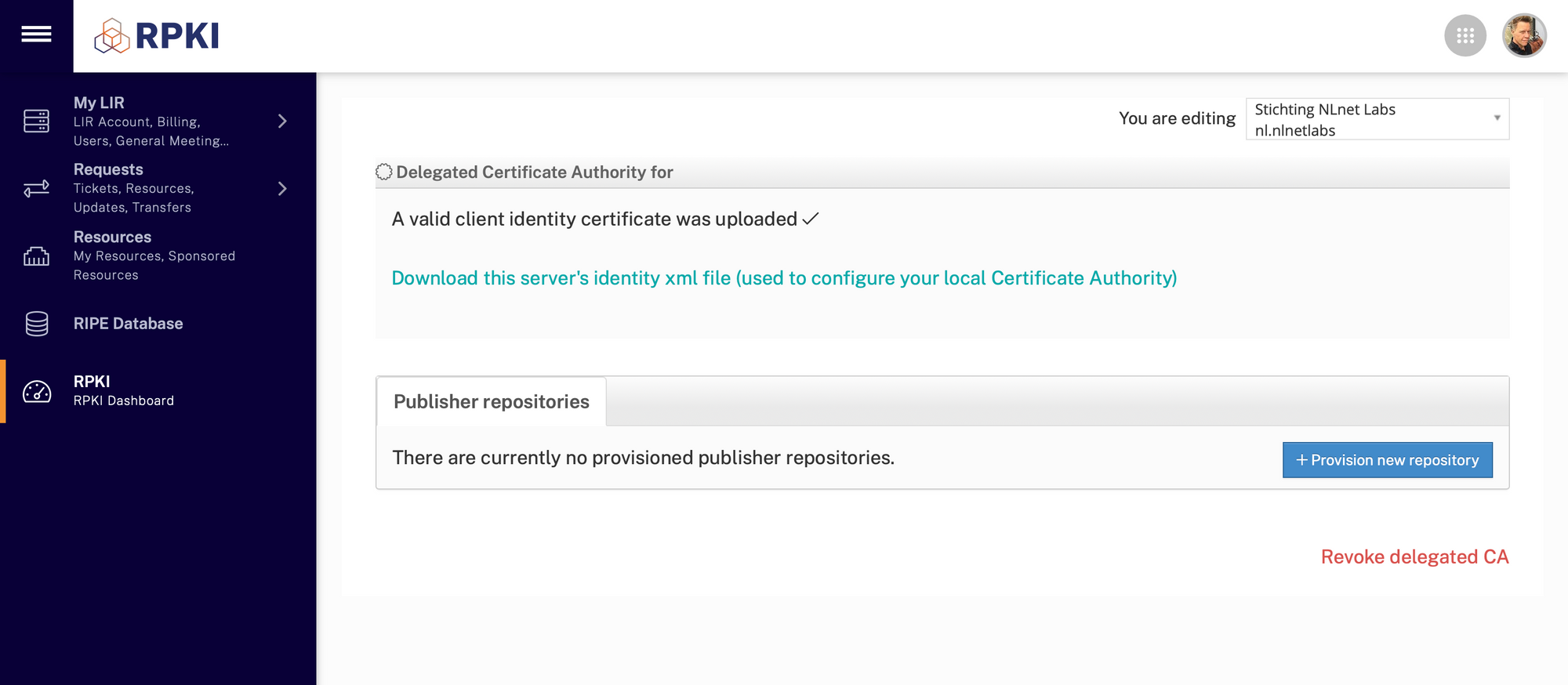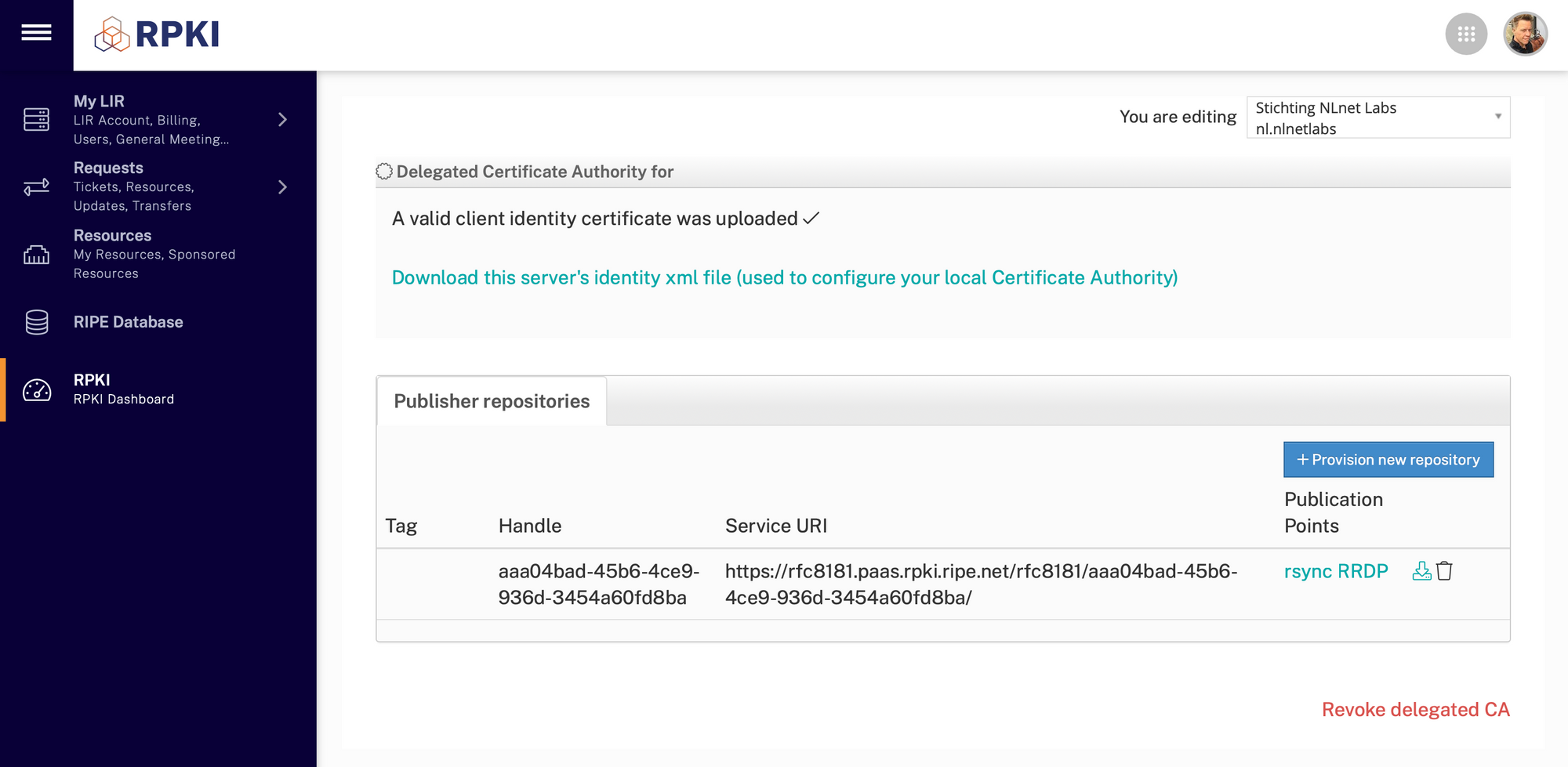 krillc repo request --ca ripe-ncc-demoNow, go back to the LIR Portal. In the "Publisher repositories" section, click the Provision new repository button: