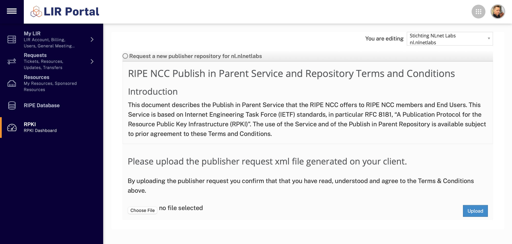 Because we want to use the RIPE NCC's RPKI Publication as a Service, we'll now go through similar steps to submit a Publisher Request in the LIR Portal and give a Repository Response back to Krill.