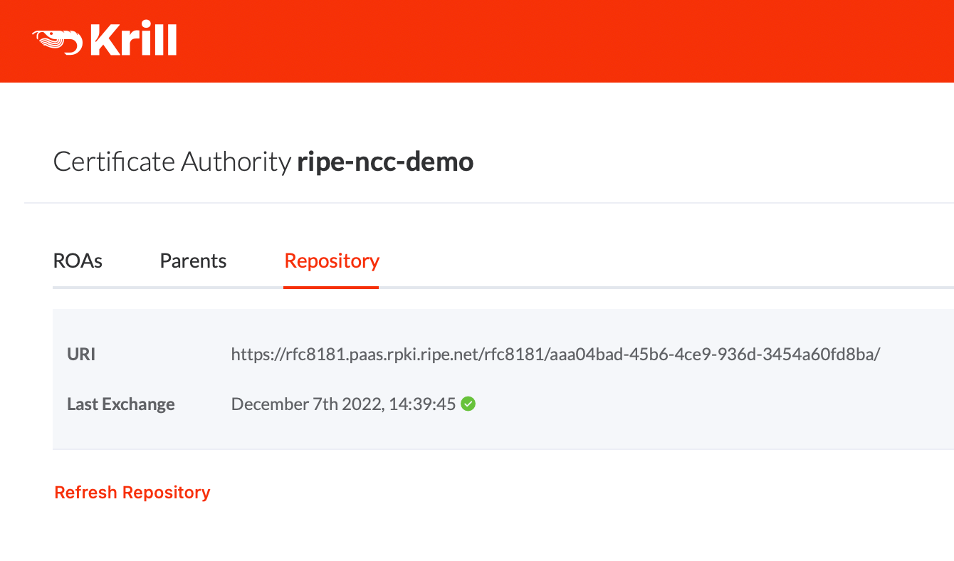 --response ./data/repository-response.xmlIf everything is successful Krill will immediately bring you to the ROAs tab so you can get to work, but navigating back to the Repository tab will show you the details:
