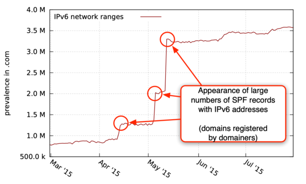 Over the course of 2017, we collaborated with our project partner SURFnet to study if we could use OpenINTEL data for pro-active security purposes. In particular, we wanted to test if we could use data from OpenINTEL to combat a notoriously difficult to block type of spam e-mail called “snowshoe spam”. This type of spam operation relies on spreading the load of sending spam over many different IP addresses and domains, thus leaving a less obvious footprint (akin to how snowshoes spread the weight of a person to avoid sinking into the snow). This makes it difficult to use traditional blacklisting approaches to block this type of spam. OpenINTEL team member Olivier van der Toorn developed a methodology based on machine learning to predict which domains found in the OpenINTEL dataset are configured for this type of spam. He successfully tested his method in the SURFmailfilter services that SURFnet runs for academic institutions in The Netherlands, showing that he could reliably detect and help filter out snowshoe spam. His method found this type of spam operation up to 180 days before the domains finally made it to “classic” blacklists. Olivier presented his paper at the NOMS 2018 conference in Taipei, Taiwan, and received the best paper award for his contribution.